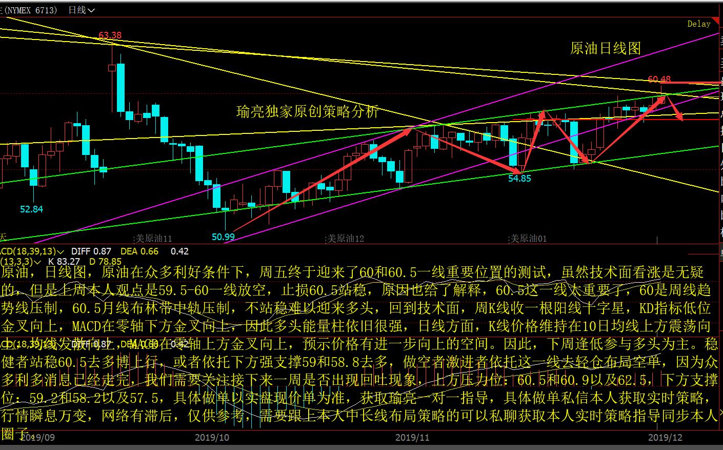 原油,日线图,原油在众多利好条件下,周五终于迎来了60和60.5一线重要位置的测试,虽然技术面看涨是无疑的,但是上周本人观点是59.5-60一线放空,止损60.5站稳,原因也给了解释,60.5这一线太重要了,60是周线趋势线压制,60.5月线布林带中轨压制,不站稳难以迎来多头,回到技术面,周K线收一根阳线十字星,KD指标低位金叉向上,MACD在零轴下方金叉向上,因此多头能量柱依旧很强,日线方面,K线价格维持在10日均线上方震荡向上,均线发散向上,MACD在零轴上方金叉向上,预示价格有进一步向上的空间。因此,下周逢低参与多头为主。稳健者站稳60.5去多博上行,或者依托下方强支撑59和58.8去