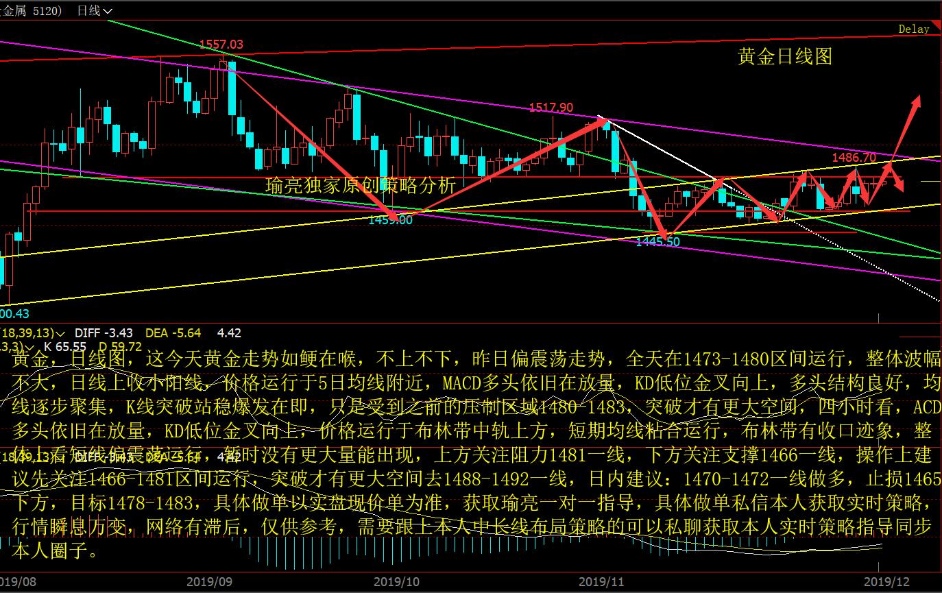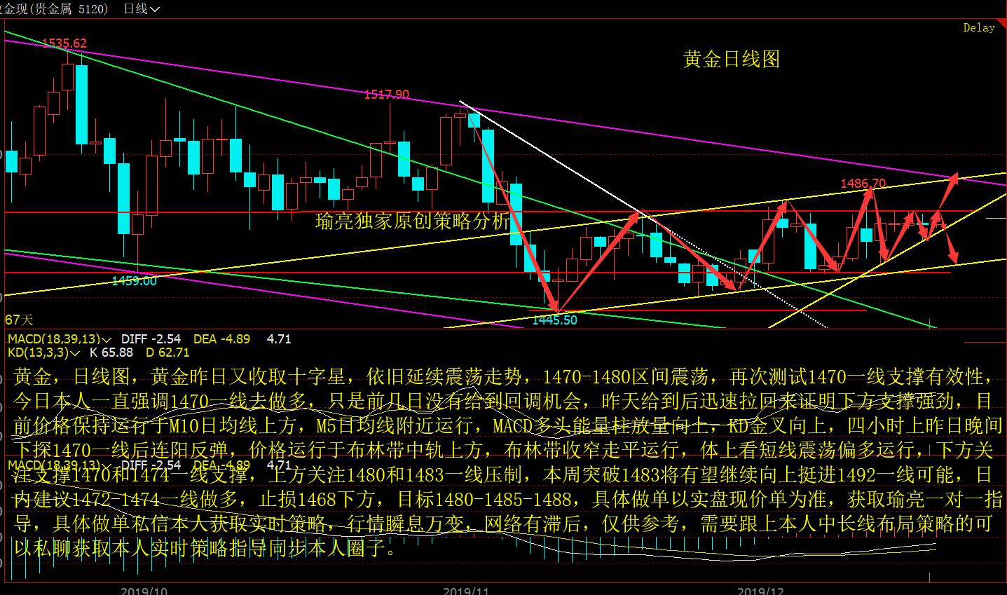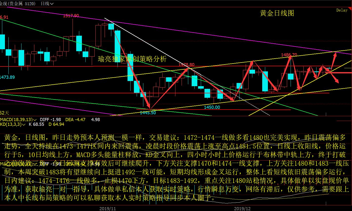黄金,日线图,昨日走势预本人预测一模一样,交易建议1472-1474一线做多看1480也完美实现,昨日震荡偏多走势,全天持续在1473-1477区间内来回震荡,凌晨时段价格震荡上涨至高点1481.5位置,日线上收阳线,价格运行于5,10日均线上方,MACD多头能量柱释放,KD金叉向上,四小时小时上价格运行于布林带中轨上方,终于打破之前收敛三角,今日回测支撑有效后可继续爬升,下方关注支撑1470和1474一线支撑,上方关注1480和1483一线压制,本周突破1483将有望继续向上挺进1492一线可能,短期均线形成金叉运行,整体上看短线依旧震荡偏多运行,日内建议:1474-1476一线做多,止损
