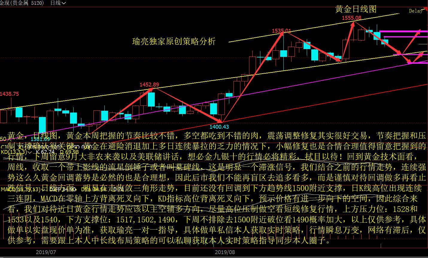 黄金,日线图,黄金本周把握的节奏比较不错,多空都吃到不错的肉,震荡调整修复其实很好交易,节奏把握和压制支撑确认很关键,黄金在避险消退加上多日连续暴拉的乏力的情况下,小幅修复也是合情合理值得留意把握到的行情,下周留意9月大非农来袭以及美联储讲话,想必金九银十的行情必将精彩,拭目以待!回到黄金技术面看,周线,收取一个带上影线的流星倒锤子或者叫墓碑线,这是明显一个滞涨信号,我们结合之前的行情走势,连续强势这么久黄金回调蓄势是必然的也是合理想,因此后市我们不能再盲区去追多看多,而是谨慎对待回调做多再看止跌信号,日线方面,明显在走收敛三角形走势,目前还没有回调到下方趋势线1500附近支撑,日K线高位出