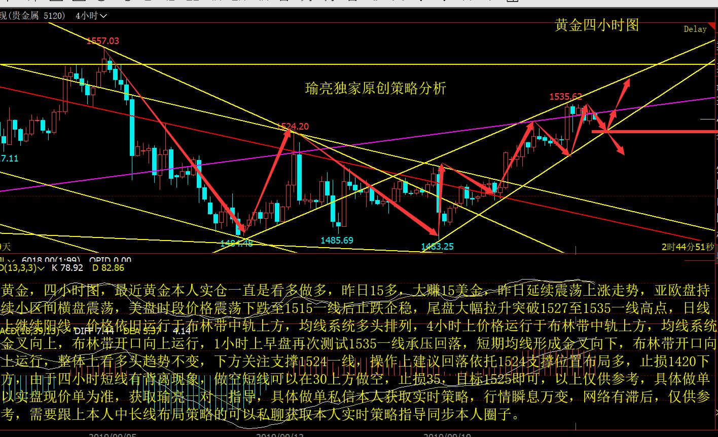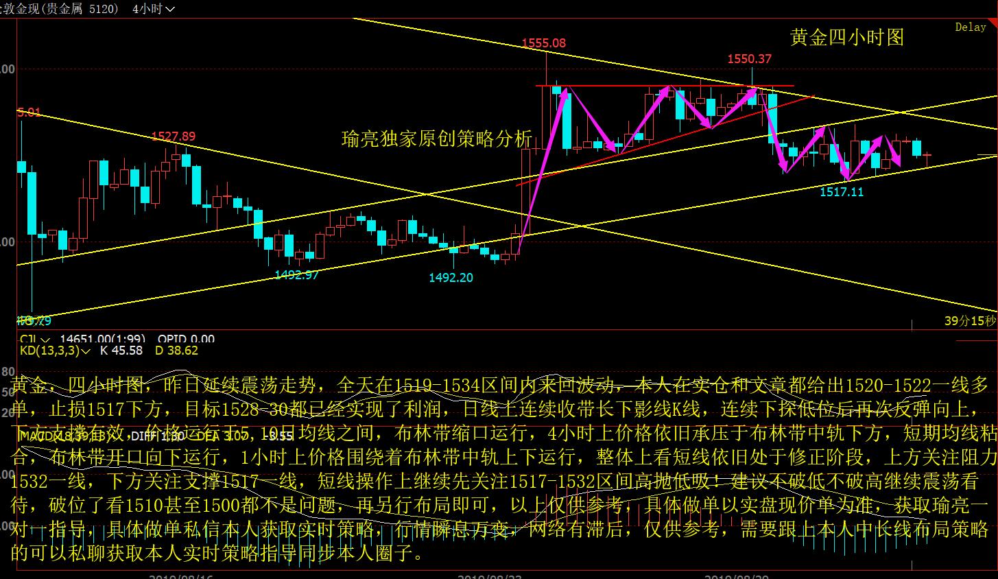 黄金,四小时图,最近黄金本人实仓一直是看多做多,昨日15多,大赚15美金,昨日延续震荡上涨走势,亚欧盘持续小区间横盘震荡,美盘时段价格震荡下跌至1515一线后止跌企稳,尾盘大幅拉升突破1527至1535一线高点,日线上继续阳线,价格依旧运行于布林带中轨上方,均线系统多头排列,4小时上价格运行于布林带中轨上方,均线系统金叉向上,布林带开口向上运行,1小时上早盘再次测试1535一线承压回落,短期均线形成金叉向下,布林带开口向上运行,整体上看多头趋势不变,下方关注支撑1524一线,操作上建议回落依托1524支撑位置布局多,止损1420下方,由于四小时短线有背离现象,做空短线可以在30上方做空,止损