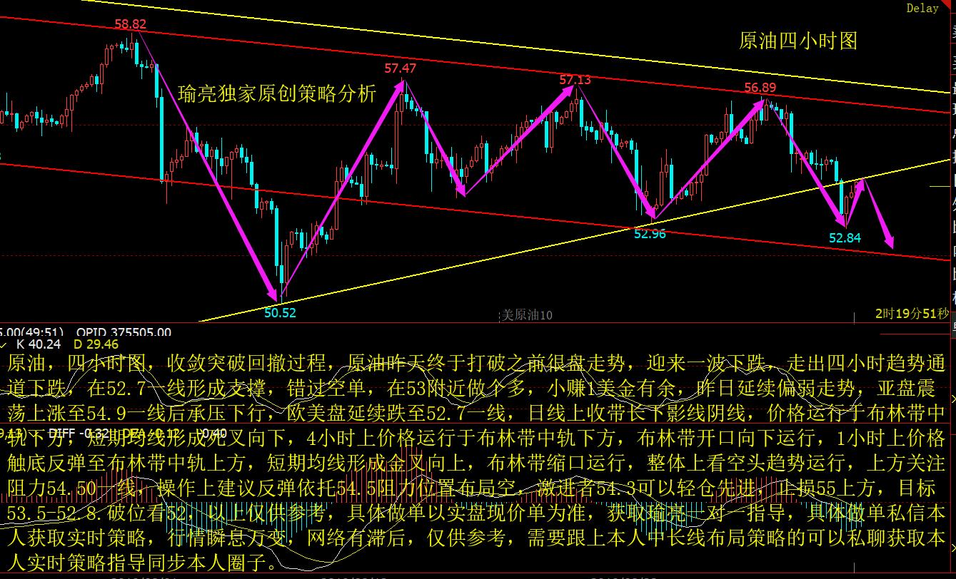 原油,四小时图,收敛突破回撤过程,原油昨天终于打破之前很盘走势,迎来一波下跌,走出四小时趋势通道下跌,在52.7一线形成支撑,错过空单,在53附近做个多,小赚1美金有余,昨日延续偏弱走势,亚盘震荡上涨至54.9一线后承压下行,欧美盘延续跌至52.7一线,日线上收带长下影线阴线,价格运行于布林带中轨下方,短期均线形成死叉向下,4小时上价格运行于布林带中轨下方,布林带开口向下运行,1小时上价格触底反弹至布林带中轨上方,短期均线形成金叉向上,布林带缩口运行,整体上看空头趋势运行,上方关注阻力54.50一线,操作上建议反弹依托54.5阻力位置布局空,激进者54.3可以轻仓先进,止损55上方,目标53