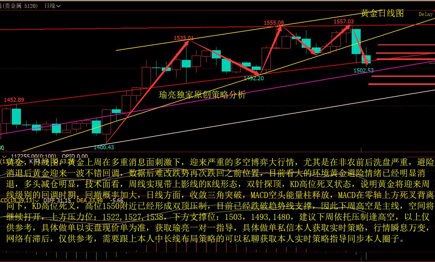 黄金,日线图,黄金上周在多重消息面刺激下,迎来严重的多空博弈大行情,尤其是在非农前后洗盘严重,避险消退后黄金迎来一波不错回调,数据后难改跌势再次跌回之前位置,目前看大的环境黄金避险情绪已经明显消退,多头减仓明显,技术面看,周线实现带上影线的K线形态,双针探顶,KD高位死叉状态,说明黄金将迎来周线级别的回调时期,回撤概率加大,日线方面,收敛三角突破,MACD空头能量柱释放,MACD在零轴上方死叉背离向下,KD高位死叉,高位1550附近已经形成双顶压制,目前已经跌破趋势线支撑,因此下周高空是主线,空间将继续打开,上方压力位:1522,1527,1538,下方支撑位:1503,1493,1480,