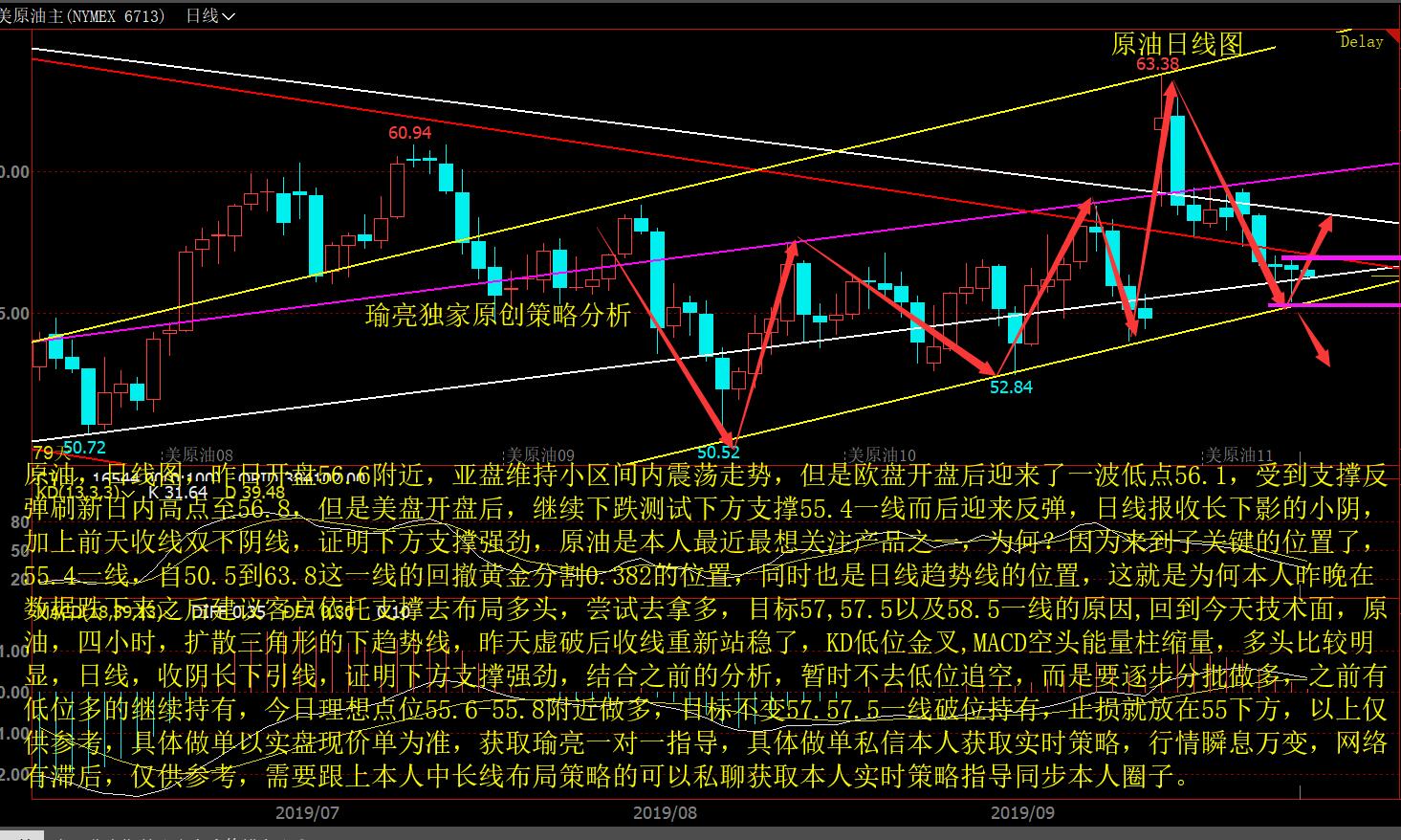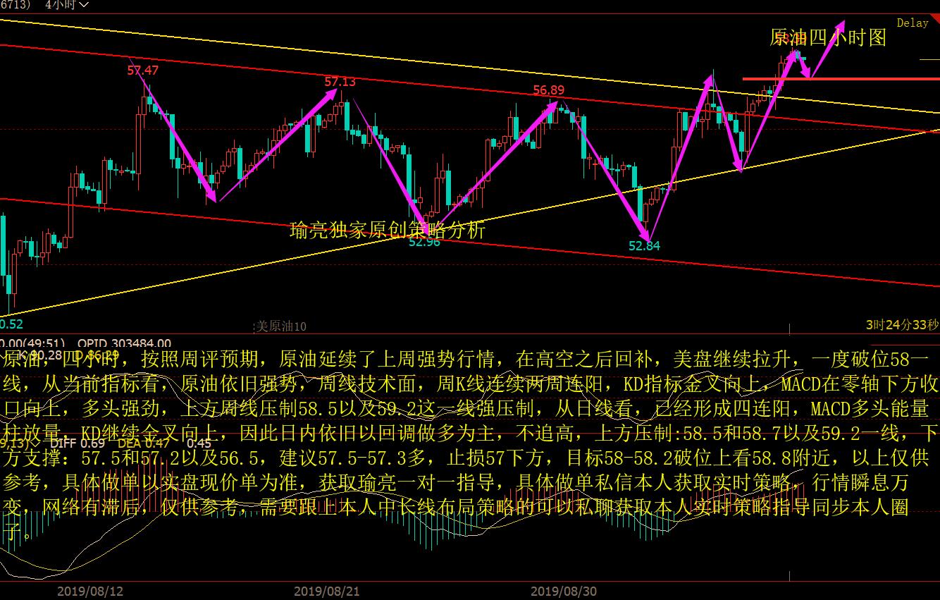 原油,四小时,按照周评预期,原油延续了上周强势行情,在高空之后回补,美盘继续拉升,一度破位58一线,从当前指标看,原油依旧强势,周线技术面,周K线连续两周连阳,KD指标金叉向上,MACD在零轴下方收口向上,多头强劲,上方周线压制58.5以及59.2这一线强压制,从日线看,已经形成四连阳,MACD多头能量柱放量,KD继续金叉向上,因此日内依旧以回调做多为主,不追高,上方压制:58.5和58.7以及59.2一线,下方支撑:57.5和57.2以及56.5,建议57.5-57.3多,止损57下方,目标58-58.2破位上看58.8附近,以上仅供参考,具体做单以实盘现价单为准,获取瑜亮一对一指导,具体