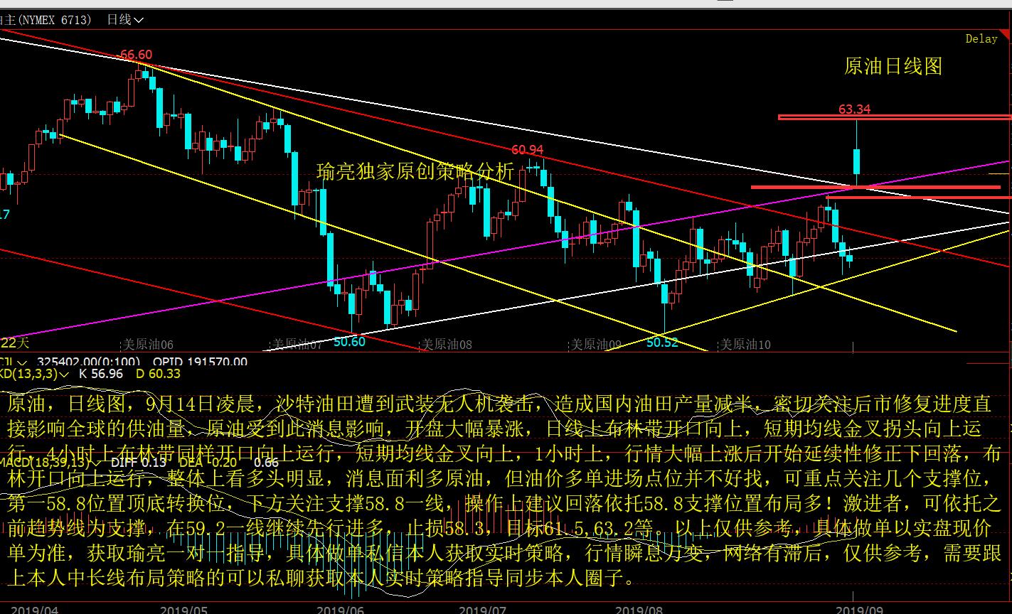 原油,日线图,9月14日凌晨,沙特油田遭到武装无人机袭击,造成国内油田产量减半,密切关注后市修复进度直接影响全球的供油量,原油受到此消息影响,开盘大幅暴涨,日线上布林带开口向上,短期均线金叉拐头向上运行,4小时上布林带同样开口向上运行,短期均线金叉向上,1小时上,行情大幅上涨后开始延续性修正下回落,布林开口向上运行,整体上看多头明显,消息面利多原油,但油价多单进场点位并不好找,可重点关注几个支撑位,第一58.8位置顶底转换位,下方关注支撑58.8一线,操作上建议回落依托58.8支撑位置布局多!激进者,可依托之前趋势线为支撑,在59.2一线继续先行进多,止损58.3,目标61.5,63.2等。