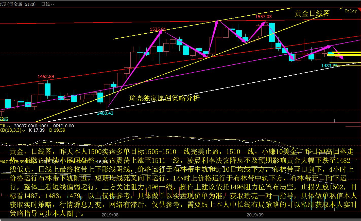 黄金,日线图,昨天本人1500实盘多单目标1505-1510一线完美止盈,1510一线,小赚10美金,昨日冲高回落走势,亚欧盘持续小区间盘整,美盘震荡上涨至1511一线,凌晨利率决议降息不及预期影响黄金大幅下跌至1482一线低点,日线上最终收带上下影线阴线,价格运行于布林带中轨和5,10日均线下方,布林带开口向下,4小时上价格运行布林带下轨附近,短期均线死叉向下运行,1小时上价格运行于布林带中轨下方,布林带开口向下运行,整体上看短线偏弱运行,上方关注阻力1496一线,操作上建议依托1496阻力位置布局空,止损先放1502,目标看1487,1483,1479,以上仅供参考,具体做单以实盘现价单