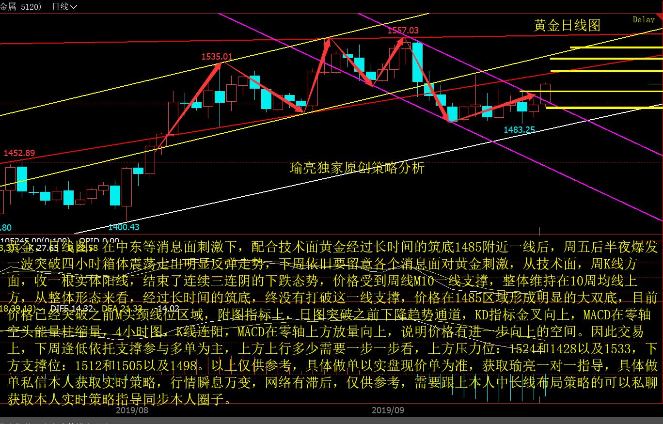 黄金,日线图,在中东等消息面刺激下,配合技术面黄金经过长时间的筑底1485附近一线后,周五后半夜爆发一波突破四小时箱体震荡走出明显反弹走势,下周依旧要留意各个消息面对黄金刺激,从技术面,周K线方面,收一根实体阳线,结束了连续三连阴的下跌态势,价格受到周线M10一线支撑,整体维持在10周均线上方,从整体形态来看,经过长时间的筑底,终没有打破这一线支撑,价格在1485区域形成明显的大双底,目前价格已经突破之前M头颈线位区域,附图指标上,日图突破之前下降趋势通道,KD指标金叉向上,MACD在零轴空头能量柱缩量,4小时图,K线连阳,MACD在零轴上方放量向上,说明价格有进一步向上的空间。因此交易上,