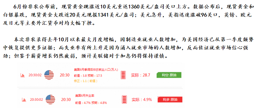 【馨悦点金】非农利空,白银空单解套,还能看空吗? 文/馨悦点金/微信xyuedj 【非农数据解析】 北京时间周五20:30公布的美国6月季调后非农就业人口增长28.7万人,创下2015年10月以来新高,超过预期的17.5万人,前值从3.8万人下修至1.1万人;6月失业率为4.9%,预期为4.8%,前值为4.7%。美国劳工部称,6月新增就业人数主要出