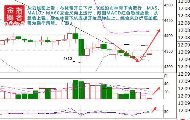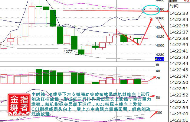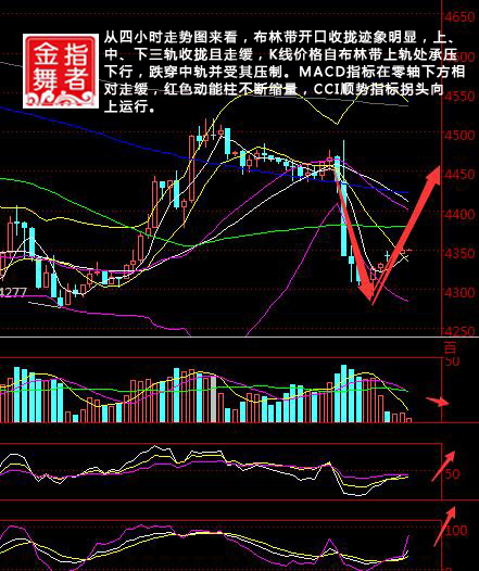 金指舞者7.11晚间沥青4380做空获利 金指舞者/@微信xhljpop8888/文 从日线上看布林带开始张口向上运行,K线缠绕布林带下轨运行,红色能动放量,平均线运行于零轴上,CCI指标拐头向上,但从小时线上看,K线受阻于布林带中轨压力,KDJ指标线三线向上发散,日均线交叉已形成,指标突破中轨4350点位上升还有空间,在4360-4380一