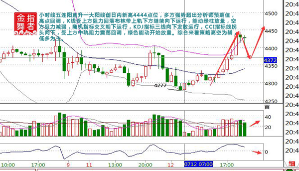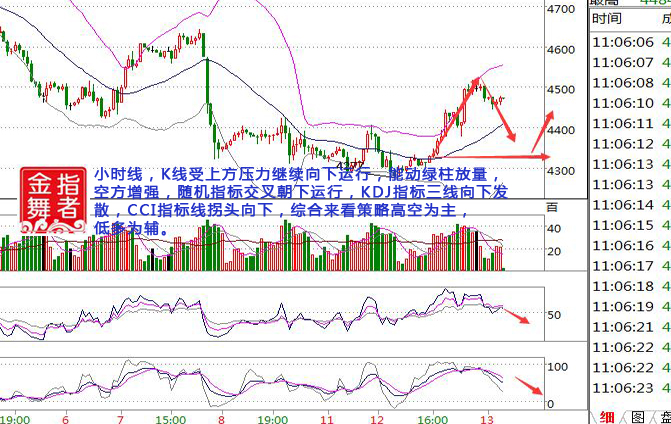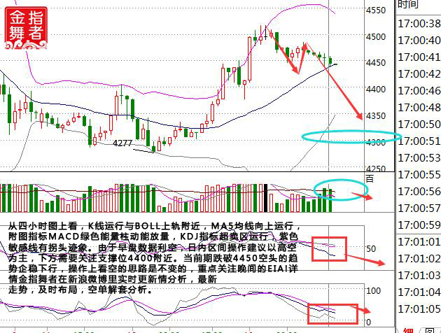 金指舞者7.13库存EIA数据公布后市对比点评及解套 金指舞者/文/ 日间行情以阶梯式下走运行,到午间反调上升到4477点位。美盘时刻开始回落,各项指标趋向利空。 之前日将金指舞者预测操作建议以高空为主,下方需要关注支撑位4400附近。当前期跌破4450空头的趋势企稳下行,操作上看空的思路是不变的,重点关注晚间的EIA! 详情