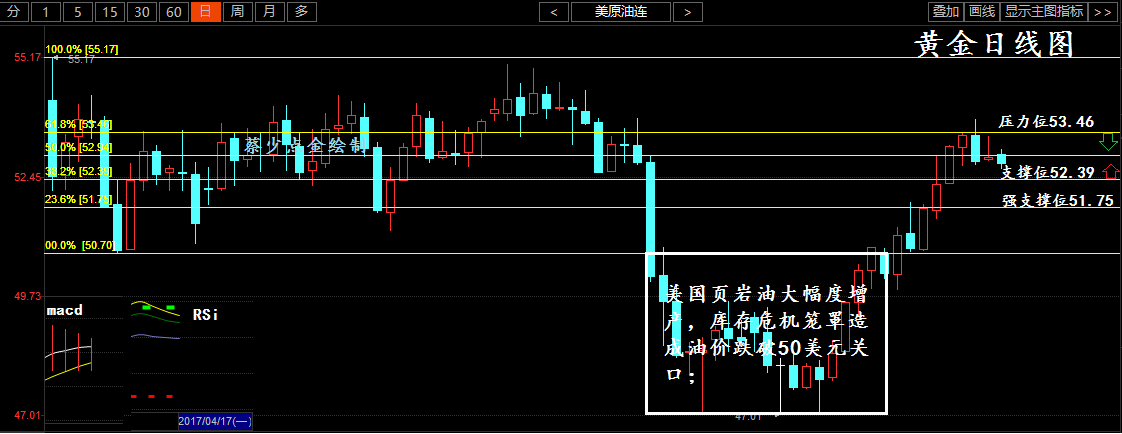 来看macd技术指标红色能量柱缩量,但是相对强弱指标RSI拐头向下,原油的行情有回落的需求,在黄金分割线上来看,行情承压黄金分割线0.618一线承压回落,所以上方的压力位在53.46美元,下方支撑位在52.39一线,技术面操作上以反弹做空操作为主; 原油实时在线喊单,解套指导可以加微信:hdjf88【复制获取】