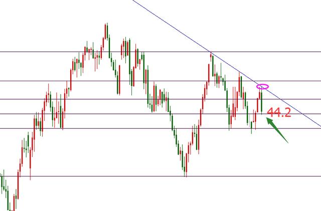 美原油技术面 昨天原油在EIA数据出来后来了一波过山车,从四小时看,欧盘开启到美盘最后收线,处于连阴形态已经打开布林带下轨。上方MA5和MA10均线目前都表现死叉空头下垂的形态,MACD指标空头能量柱开始缩量。下方关注第一支撑43.5美元,强力支撑43美元。日内操作思路低多为主。 美原油操作建议 1、下方见43-43.2附近进场