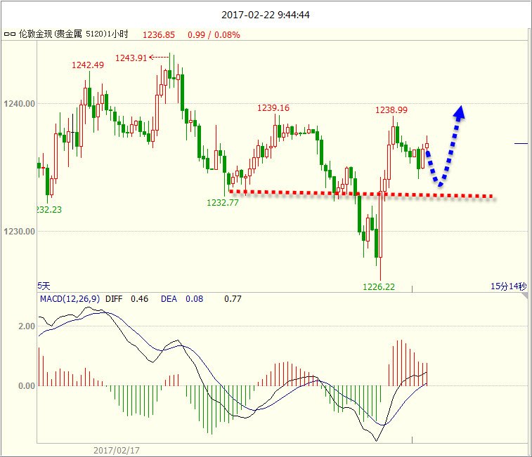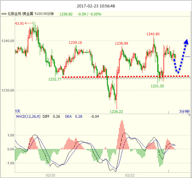 美元上周最初受到CPI表现良好,配合之前美国总统特朗普宣称的税务改革计划,美元瞬时跳涨,稍后却因工业产出等经济表现欠佳,而高位滑落,深度回撤,而后美联储主席耶伦作国会政策,重申美国加息前景,美元探底回升。4小时图像显示,美元仍旧运行在100.60一线重要支撑上方,整体仍表现多头趋势,现在美元交投于布林中轨压制