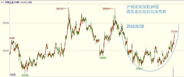 【熊峰理财】有色金属三大品种探底回升的走势已经成型。 下图是沪铜连续指数,圆弧底形态构筑完毕。圆弧底是底部看涨形态。逢低介入多单。 下图是沪铝1H图走势,在11605位置构筑了底部蝴蝶形态走势,底部蝴蝶成型将会展开abc三浪的调整浪后继续上攻。建议11500上方构筑多单。 下图是锌的价格走势,今天1小时图内的大涨,已