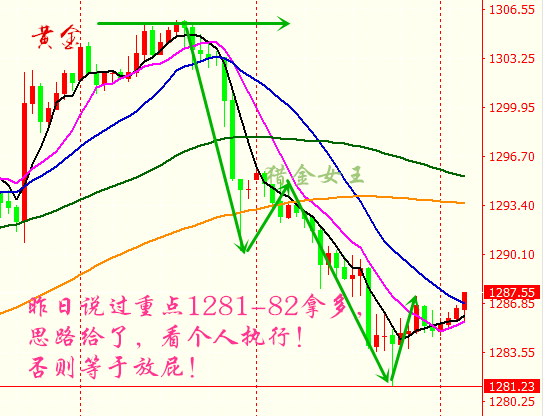 猎金女王:10.18早评,黄金多、空双杀1281-83多持有 今日,思路: 昨日说过重点1281-82拿多,思路给了,看个人执行! 否则等于放屁! 目标暂不变!!!原1285/86多早间已出局,1281-83多持有看欧美盘!!! 趋势送你了!执行力坚守力看个人修行了 而不是事后天天跑来问我多、空! 这样的交易没有意义,既然是老手,就不要干