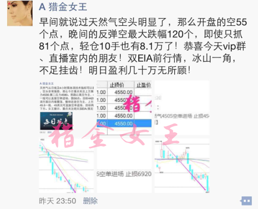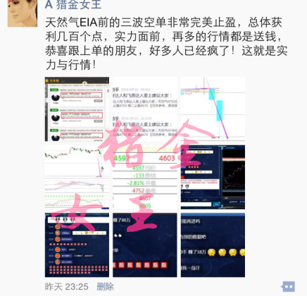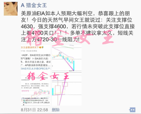 金兰:EIA利空油价跌成狗,做空的我解原油天然气豆油多单! 猎金女王温馨提示:今晚EIA已经属于过去,人应该往前看,明晚天然气EIA又要来袭了,希望大家不要被今晚的失利所影响,一时得失无关紧要,明晚只要布局好了就又是一波盈利,要回补今晚的损失那是分分钟的事情,所以要勇敢往前看,希望就在眼前,实时关注女王vip群