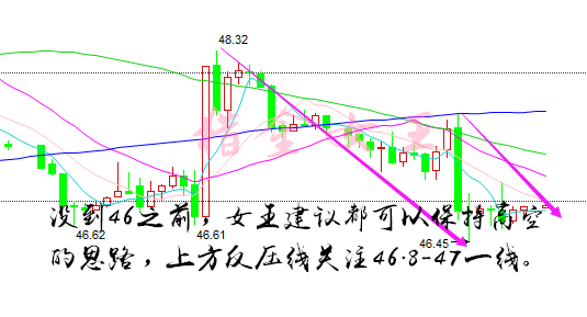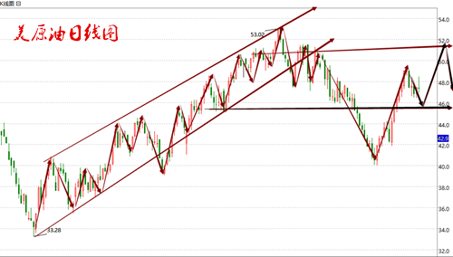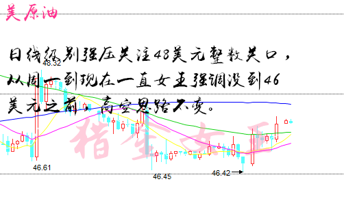 金兰:8.26早评 EIA天然气怒涨,金五美原油策略空解套! 美原油行情解析-- 原油昨日天然气的EIA利空之后,油价自47.7美元附近直线下滑至46.5美元一线,跌幅1.2美元。女王短线来看,日线图跌破5.10日均线支撑,虽隔夜没有延续跌势,但短线预计将以弱势震荡为主,直接继续走强的可能性不大。日线图上,跌破5、10日均线支撑,