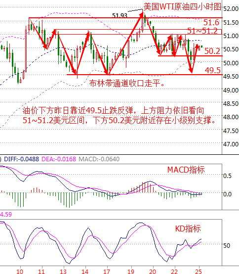 金盘神手:10.24原油沥青天然气白银行情技术指导晚间做单策略 市场行情分析 周一(10月24日)亚市尾盘时段,国际油价开始震荡走高,不过目前仍小幅下跌。美油亚盘时段最低触及50.41美元/桶,目前交投于50.62美元附近,跌幅约0.45%。 上周六美国油服公司贝克休斯公布的数据显示,美国10月21日当周油服贝克休斯石油钻井总数增至