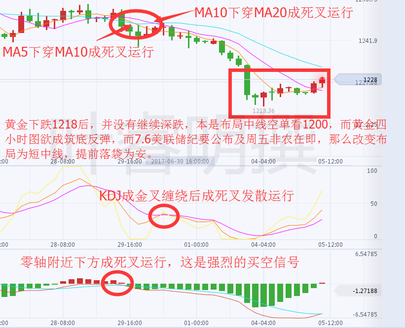 叶睿明:7.4黄金暴跌多单被套怎么解套及黄金后市技术分析 黄金方面,此前早就说过黄金会仍然延续上周的跌势,晚间不出意料迎来一波暴跌。目前日线级别已经在这一区间范围内持续震荡了10多根K线,黄金周线上周更是收一根中阴线,所以今日日内开盘便延续了上周跌势。日线来看,5日均线与10日均线死叉仍旧向下发展运行,MACD零