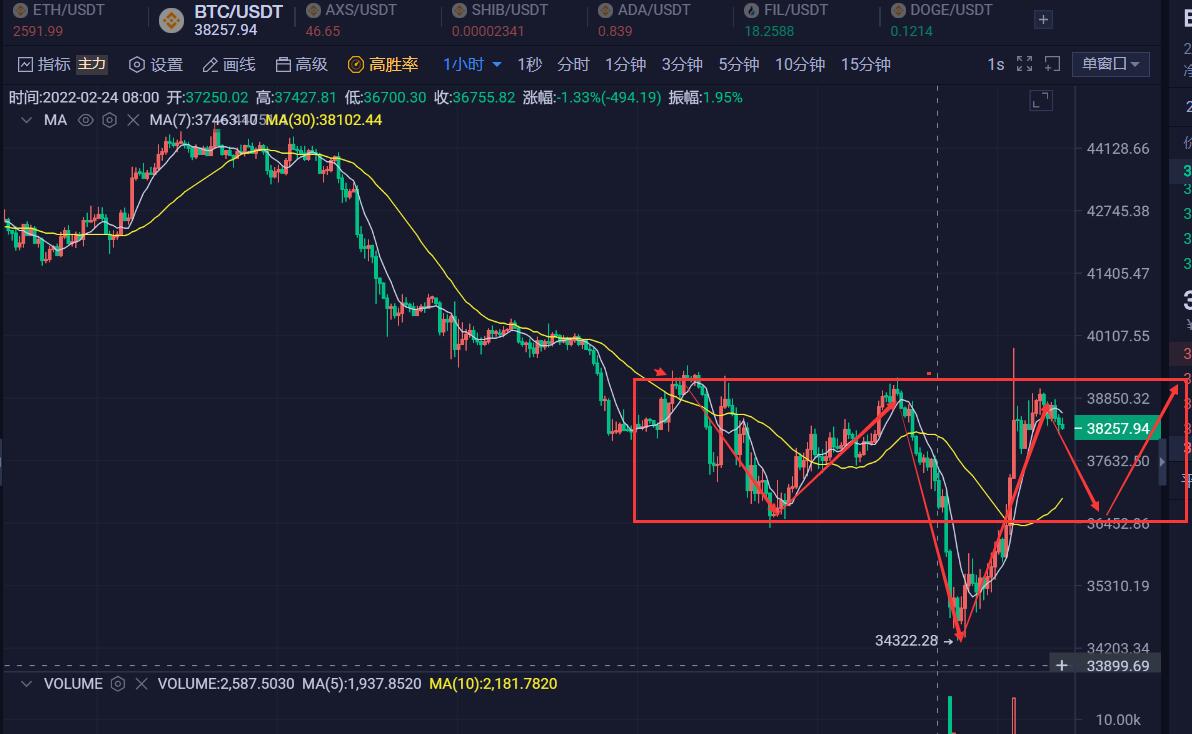一场俄乌冲突血洗了金融市场,昨日伴随着俄罗斯和乌克兰的战争打响,全球包括股票,外汇,黄金,原油已经****和期货都受影响严重,市场不少的投资朋友口头语“感觉是用我的钱在打仗”,其实也不难理解,当今世界上金融全球共同性,随着一个时期的格局变化金融市场的动荡是难免的,好在这个战争打完市场还是会回归常态的,不用过度恐慌。昨日大饼和以太白天大幅下挫测试了下方前低点位置的支撑,随后晚间尾盘有大幅拉升上去最终日线收阳。这样的走势符合我们之前的预期,前面老刘我也不断强调,行情跌破前期震荡的低点支撑之后,大概率会有测试下方低点支撑的走势出来,反转也会在行情测试下方支撑之后走出,现在看来还是没有脱离技术面运行