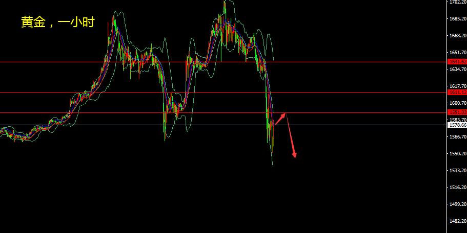 今晚注定是个不眠之夜了,果然行情最终还是迎来的爆发,晚间黄金再次暴跌不断破位下方支撑,下方1611美元一线支撑和1590美元一线支撑好像纸糊的一样一捅就破,截止到目前发文为止,黄金已经最低跌至1560美元,现在有所反弹至1570美元附近,黄金日内跌幅90已达美元的空间,超出了上周五的80多美元下跌的记录了。另一方面相比于黄金原油走势相对来说就很温和了,美盘开始延续白天的跌势,盘中最低跌至30.3美元一线触及布林带下轨之后开始反弹,却又在涨至32.5美元一线之后迅速回落下来,目前维持在31.4美元附近震荡。 今天这样的行情实际上没有必要写什么解套思路了,面对黄金这么大幅的下跌,估计被空头下跌拉