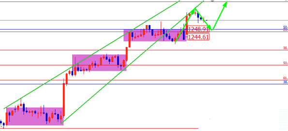 消息加黄金分析: 昨日黄金市场小区间波动,行情早盘低开在1243.55的位置后行情开始上行过程,随后震荡整理到美盘最高触及到了1251.3的位置后行情开始整理过程,随后回落,最终日线收线在了本轮大周期回落斐波那契的50关口1248.6的位置后,日线以一根上影线较长的光脚中阳线收尾,而这样的形态收尾后,日线虽然有效上破本轮