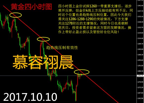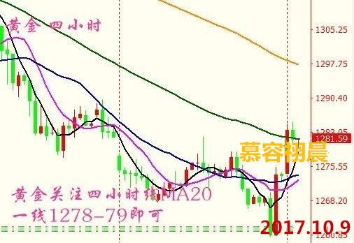 慕容祤晨:10.9黄金非农反转上涨,原油上涨无望 黄金今日开盘未给回调就直接上涨到了1280上方,那么现在上方注意的是1282的突破情况,当然,早盘急涨也先别追多,若是这样的上涨延续到欧盘,那么在美盘前有回落是有再次进多的机会的;或者等1282突破了,后面有的是做多的机会,早上没做到多单的就先别追了!从整体来看,黄金