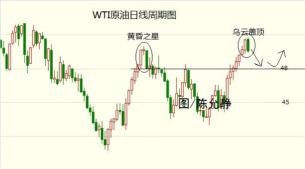 自9月底的EIA数据(9.28)起始,油价形成了新一轮的阶梯上涨行情,加上本周API和EIA的强力助涨催化,WTI原油价格再次刺破50美元大关,强势多头一度锋芒毕露;但周五空头回补的抛盘行情,给了多头一记当头棒喝;WTI日线周期上目前形成阴包阳,也可以称之为乌云盖顶的形态,对多头及其不利好,这种形态会使得我们下周初以延续