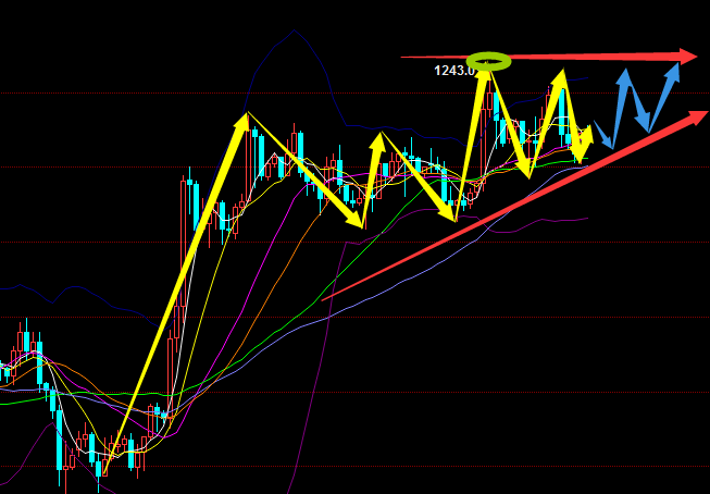 导读 每一天每一分一秒都是一个新的开始,昨天的盈利已经是过去式,我们还需要再接再厉,前一单的失误已成为历史,我们还需重拾信心,做好下一单。投资目的是赚钱,三分技术七分心态,盈利的时候你有过膨胀吗?亏损的时候你有过绝望吗?不管过去如何,我希望现在的你,未来的你能保持一颗平常心,只有这样你才能一往无前! 美黄金行情回顾 近期由于美指的上涨,金价受到阻力多个交易日形成震荡,本周一黄金再次延续上周小幅震荡下跌趋势,日内最高到达1232,最低跌至1222,收盘于1224。周二受美股抛售影响金价再度冲高,所幸的是此次冲高最终突破本月前期高位1238来到1243。随后美盘时段金价回吐了日内的大部分涨幅,最