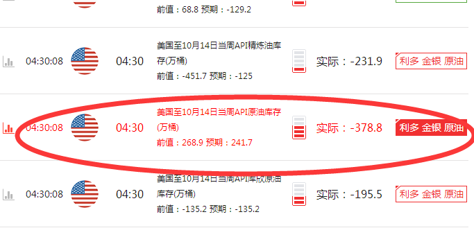 前言 你的命里不是缺少财富,而是缺少贵人为你指点迷津。千里马常有,而伯乐不常有,人生最快意的三件事莫过于:棋逢对手,酒逢知己,将遇良才!投资路上,本人愿为你指点迷津,更愿做你的真心朋友。 消息面 北京时间周三(10月19日)凌晨4:30,美国石油协会(API)公布的数据显示,截至10月14日当周,美国API原油库存意外大幅