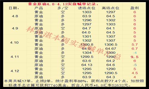 入场时不犹豫,入场后不后悔,行情总是太短暂,没时间遗憾,错过了终究只能成为回忆。若不是终点,请微笑一直向前,交易本没有归途,如果始终保持谨慎专注,那最后一定就是赢家。 ——————本周总结 本周,收获非常多,黄金原油行情都很不错,我们抓住了利润。操作策略都是实时发送,其中包含免费现价策略喊单,部分为实仓操作,真实度可对照“林先湛”盆友圏行情策略,从不马后炮,金融市场,合作共赢,祝周末愉快! 黄金方面:现货黄金周五(4月12日)继续小幅收跌,美市盘中最低下探至1289.70美元/盎司,金价处于盘整偏弱的走势,但仍收于1290上方。美元周五遭到抛售,美元指数最低触及96.74,已跌至97关口下方