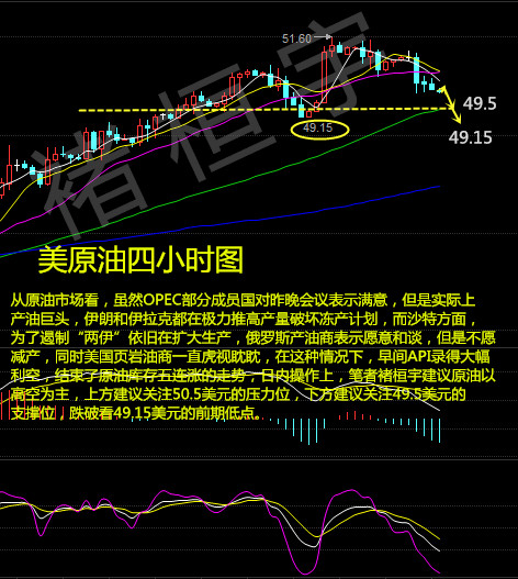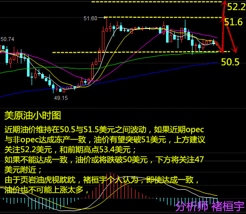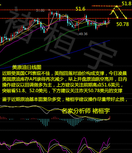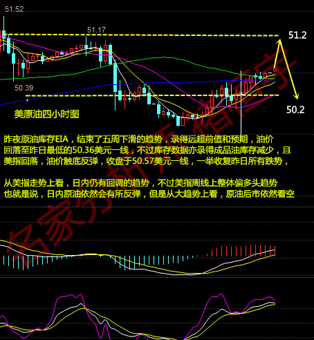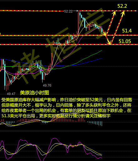 行情回顾 昨日受API影响油价开始上涨,虽亚欧盘行情走势不明显,桓宇提前布局的原油50.8美元的多单,目标52.2美元,在EIA数据出来后,原油急速拉升,在22:56分,美原油成功到到52.22美元一线,而宁贵沥青4920的多单也成功突破笔者褚桓宇给出的目标5010,出于稳健,笔者褚桓宇建议在5020平仓,而宁贵沥青随即止于5028一线,
