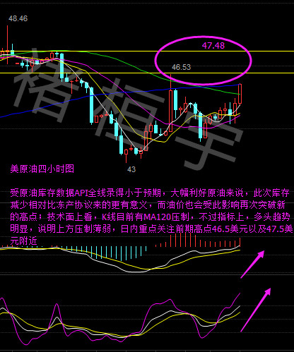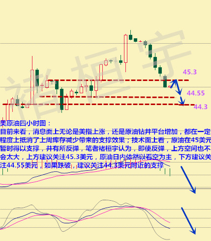 原油解析及个人观点 进入本周以来,原油市场先后受沙特冻产疑云影响呈现市场情绪利好一面,目标直冲46.5美元附近,而后在伊朗和沙特继续增产的态度下,冻产计划一度搁浅,原油遭受无名的打压,并一度跌破44美元。