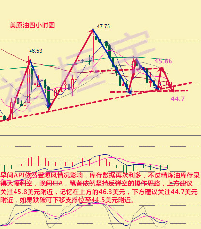 原油基本面分析 API原油库存数据称,虽然美国原油库存如市场预料的在飓风过后有所增加,但增加幅度不及预期的450万桶,WTI油价短线上扬0.5美元/桶;但与此同时,精炼油库存录得530.9万桶的增幅,为8个月来最大增幅,笔者褚桓宇认为飓风过后原油供应将会继续反弹,WTI油价随之又从45美元/桶上方跌回44-45美元/桶的区间。 笔