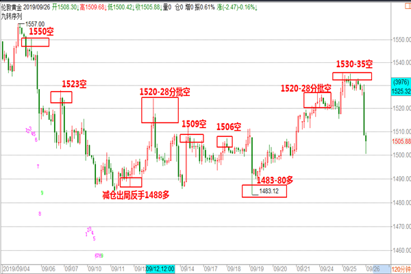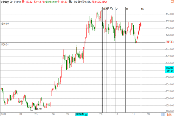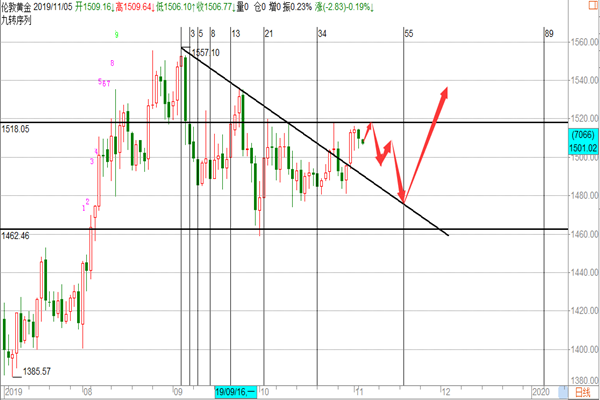 今天是2019年11月8日星期五, 昨晚到现在由于系统升级一直停网,才来网,本来开始都准备去网吧去给大家更新文章,好在赶在美盘前来网了,今天在经历了近一周的雨天后,终于是雨过天晴出太阳了,在家里打扫下卫生陪陪家人挺好,现在是北京时间下午3:37分,帮主如约与大家见面,接下来今日主题。 黄金: 隔夜黄金大跌30多美金,本周以来黄金在上破1500到1520附近后,出现瀑布式的暴跌行情,这个坑很大,在这里如果是做趋势交易没有研究时间领域的朋友,会很难受多空都是死,好在我们不是死的那一波,我们在之间的文章就已经明确的给大家提示了这方面的风险,并给到时间没有到位的分析,黄金是存在假突破的可能,两轮暴跌