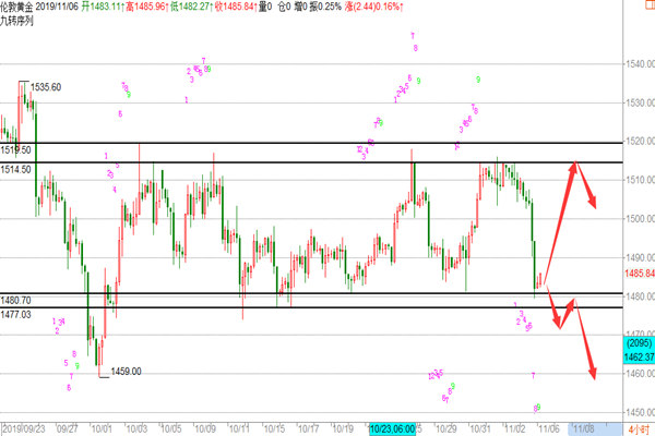 今天是2019年11月7日星期四, 昨晚睡得比较晚,现在刚醒洗漱一下开始今天的工作,今天天气比昨天要好,没有在下雨了,雨过天晴后空气格外的新鲜,看着还在熟睡中的宝宝,幸福感油然而生,生活本该如此简单,赚多赚少不重要,重要的是能和自己的家人在一起,不错过宝宝成长的每一个阶段,生活也本该如此,加油,各位! 黄金: 隔夜的黄金如我们预期的那样,没有继续走跌,而是走的反弹,没有太大同样是在1480这里企稳,整体以反弹位主基调,没有太大的悬念,昨天我们给到的位置同样偏保守没有给到进场的机会,但是思路没问题,黄金在1480这个关口是比较重要的,我们从之前的走势便能看出一二,现在到本月下旬我们依然不能排除