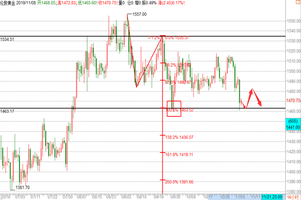 今天是2019年的11月11日, 秋冬的凉意夹杂着霾袭击了这座城市,一夜间气温就下降了许多,但这并不会阻挡上班的行人脚步,一切照旧。这就是生活,不会因为某些因素的改变而停止,而是要去学会适应生活,加油,各位! 黄金: 上周的黄金以走回落位主基调,从上破趋势线开始挖坑,后续再到破底,这个坑比较大,我们在上周初的文章已经提醒过大家,这波大跌虽没有全部吃掉,但汤还是喝了口的,而我们现在在着手去布局分析的是下一阶段的多头,这才是我们后面这段时间的重点,前面这一波跌势我们从头吃到尾,基本的点是把握的比较到位的,现阶段帮主将继续去找下阶段的点,上周五我们在1463附近布局的多单提示继续持仓,今天开盘黄金