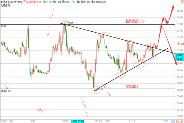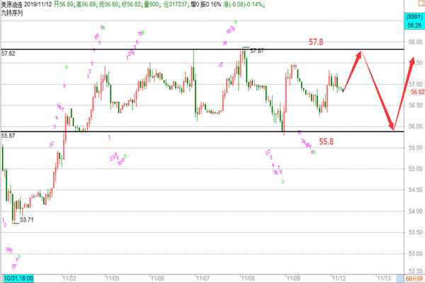 黄金: 今天是2019年11月12日星期二,黄金在经历了亚欧盘的行情后,未能继续刷低,亚盘阶段在测试了凌晨的反抽高点后未能上破后走出一波回落行情,再次回到回撤低点1448附近后,欧盘企稳开始走反弹,再次回到日内高点1458附近,整体以震荡整理行情为主,早间我们在早评给到企稳1458-60下方空一次,盘内在欧盘企稳1448-49一线后给到短多策略,目前浮盈6美金,那么美盘黄金我们应该怎么操作呢? 1、 目前黄金的小级别60-90-120-240分钟的底部结构已经写死,晚间不过分看跌,短期内黄金有反弹的需求,在下面1449附近的多单线持仓看上方的反抽高点1458-60区域的得失情况,如果晚上能突