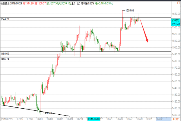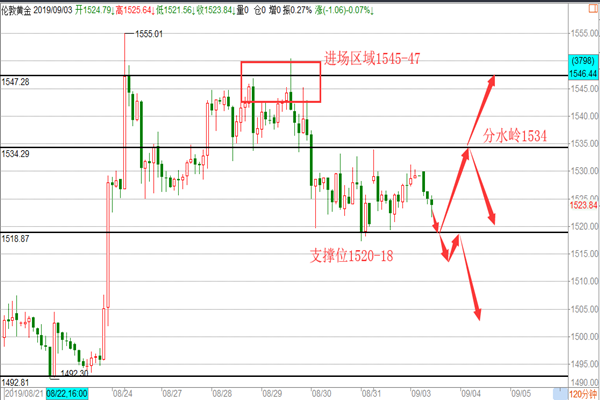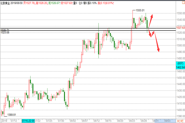 黄金: 昨天的金价在高开8美金后,先是走出一波冲高行情至日内最高点1534一线,其主要原因也是受到避险因素导致的,在冲高后亚盘黄金走出一波回撤行情,最低跌至1519日内最低点,欧盘在企稳1520上方后开始走反弹,美盘继续走多头,再次测试1531未能上破后小幅回落收尾,今天开盘黄金就开始走跌从1530一线跌至目前的1521最低点,昨天我们在周评给到企稳1527-26下方空一次,盘内在1520-22区域给到短多策略,晚间也是顺利盈利10美金出局,那么今天的黄金我们应该怎么操作呢? 1、 9月1日,美国对华3000亿美元输美产品中第一批加征15%关税措施正式实施,我就此在世贸组织争端解决机制下提起