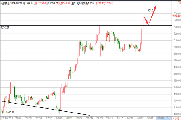 黄金: 金价在上周五受到避险情绪升温,大涨30多美金,今天在次高开19美金,并刷新前高1535一线至1555,周五的几波重磅炸弹的袭击,是黄金价格继续走高,在美联储鲍威尔讲话前的一个小时,中国宣布对美的750亿美元的商品增收关税,这一次出手反制的时机很耐人寻味,北京时间08月23日晚上8点,正好是A股上周五休市,美股还未开盘前,丢下一颗炸弹,当时,距离美联储主席鲍威尔央行年会仅仅只有120分钟,我想,鲍威尔已经来不及换演讲稿了,果不其然,鲍威尔的讲话只撑了不超过1个小时,随后,美股崩,避险飙升,恐慌蔓延,美国和中国耍了一年多的流氓,如今,中国也学会了耍流氓,然后,川皇直接就暴走了,川皇不但对