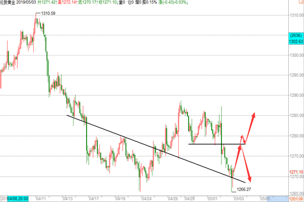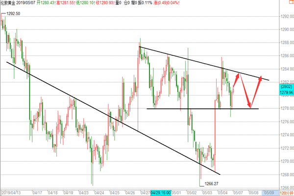 黄金: 早间在收到周末特朗普发推特威胁将关税从10%涨至25%,亚盘恒生指数大盘及原油全线跳空低开低走,股市多达200多支个股跌停盘,贸易战风波再起,使全球避险情绪升温,黄金和美元双双小幅高开,黄金在冲高至1285一线后开始回撤走缺口,欧盘开盘后继续走回落加速下跌至1276一线,美盘在企稳1278的前低位后开始反抽,后市震荡收尾,盘内我们在早评给到日内看1279-80多空分水岭操作,行情走的比较反复,我们今天没有参与,那么今天的黄金我们应该怎么操作呢? 技术面: 黄金昨天虽高开高走但欧美盘未能继续延续,反之下跌至1278-80的前低位,那么今天我们需要继续去关注这里的得失,触及这里继续多,上