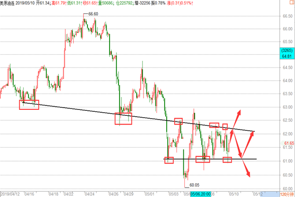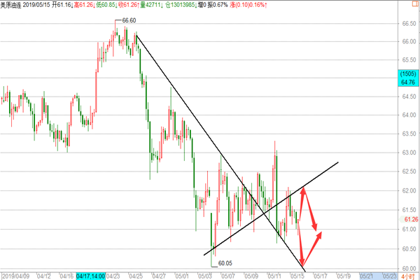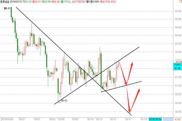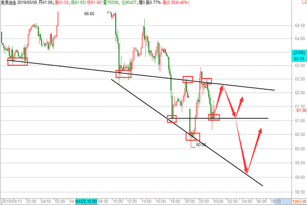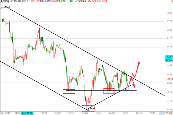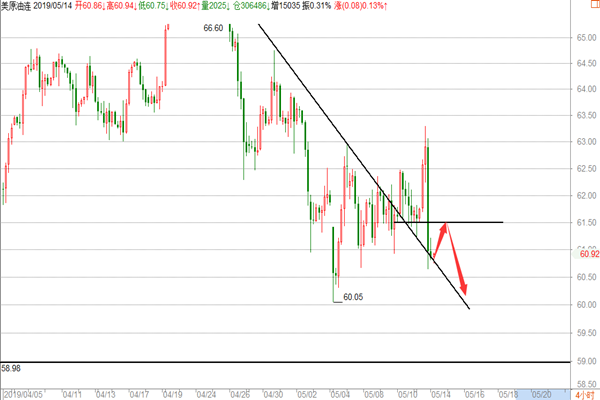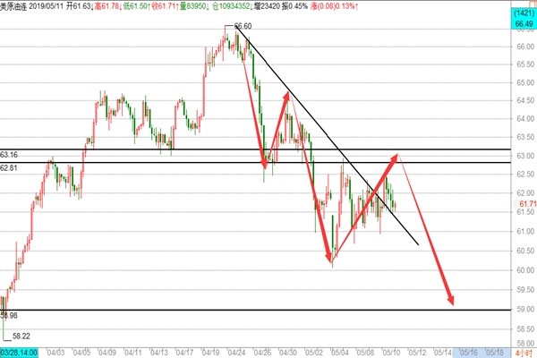 原油: 油市昨天的行情走的比较给力,整体依然围绕着空头在走,亚盘阶段在小幅回撤至61.2一线后,开始反抽,欧盘继续走多,美盘在小幅回撤后继续走高并刷新高点至63.3一线最高点,后市受到美股及中美贸易战的影响开始大幅回落,再次回到61的支撑位附近,我们在周评的文章中明确给到原油思路是没毛病的,在亚盘在跌至四小时的下行趋势线底部61.3附近布局一波多单,62.8-63区域盘内提示中线空,两波行情我们基本是全部把握到,大赚近300点的超级行情,那么在原油大跌后今天我们应该怎么操作呢? 1、 原油目前空头是毫无疑问的,我们在之前的文章中多次提及这里跌势,并在66.4和64.6及63三次中线空,全部精