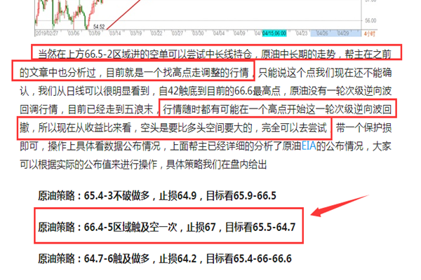 原油: 油市今天行情非常之大,晚间走出近300点的跳水行情,近期帮主的文章一直在强调原油这波次级逆向波的回调行情,我们成功的把握到了这波跳水行情,在周三的EIA给到66.4的中线空策略,具体请参考我们在EIA的布局文章(帮主:原油多周期顶部结构不追多,EIA如何布局?)经过周四周五两天的行情,原油大跌近400点,这波单子基本做在的最高点,而原油的这波跳水确认了这轮次级逆向波回撤的顶点,那么下周原油将继续开始走回落,同时我们还需重点关注五月份的美伊制裁的结果,请大家关注帮主的动态,那么原油下周我们应该怎么操作? 基本面: 美国总统特朗普:我告知欧佩克要降低油价。有消息人士称,港口官员表示,俄罗