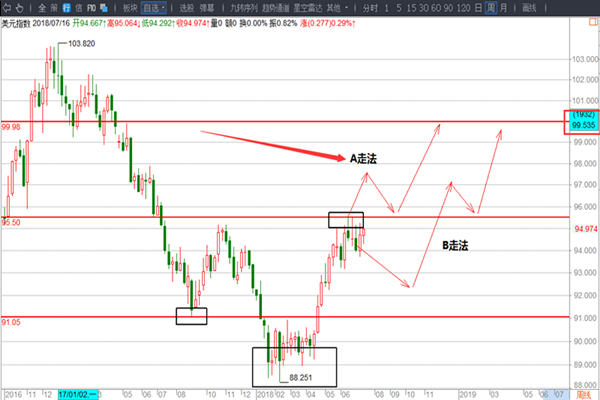 周初段金价反弹触高1266美元,极力大涨后并未守稳,此后下破1250美元后就一直维持在此下方运行,昨日盘更是触低1236美元,尾盘中有所反弹,但并未完全脱离弱势下行的局面。没有进一步下破,低位整理中也可以看出金价多头表现出的乏力,接连两周时间的运行让多头难以获得上行势能,趋弱中的空头氛围再度聚集。 美联储在周五发布了货币政策半年度报告,其报告显示美国经济稳健增长,渐进式加息符合市场发展所需,财政政策也是支持年内GDP增速,整体的措辞还是偏鹰。由此影响,美国三大股指均获得大涨,美元也在盘中触高95.2上方,这对黄金形成一定压制。 本周市场所期望的黄金反弹并未呈现,只在周初段有一