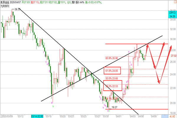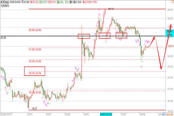 今天是2020年4月8日星期三, 隔夜黄金原油双双开始走回落,金价昨天早间开盘在一波冲高后一整天以震荡为主基调,并没有明显的大跌行情出来,回落了近30美金,隔夜黄金我们在1660附近给到空单策略,文章中短线思路给到企稳1644-37企稳多一次,可以看到基本在我们的预期内运行,隔夜的原油在多单止盈后,一直空仓观望,等待回落到位后继续多原油,盘内在25-23区域分批多的思路目前来看是没有问题的,整体的节奏点在于基本面,所以就周四的欧佩克紧急大会上美国能否参与减仓就至关重要了,基于目前的疫情情况及沙俄美三国的博弈,后市美国加入到减产中来的可能性还是比较大的,现阶段的油价耐心等上车的时机到来即可。