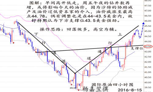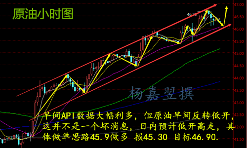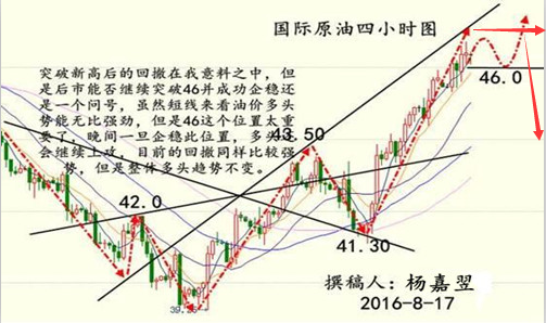 杨嘉翌:8.17EIA预计利多行情反转走空头,空单迎解套良机! 【消息面】 周三(8月17日)原油盘初,油价小幅回落。美油交投于46.42美元/桶附近,跌幅约为0.34%;布油交投于48.96美元/桶附近,跌幅约为0.55%。虽然OPEC冻产预期升温,加之美元走软,尼日利亚减产等因素提振市场乐观情绪,但是,API公布的数据显示,成本油库存意外