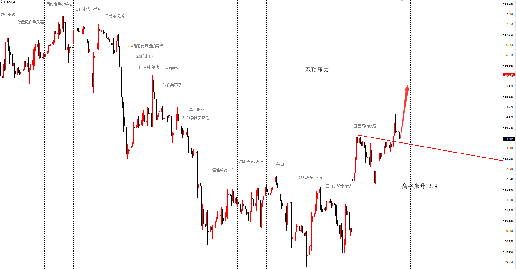 原油,正如标题所说,美盘前的行情都是比较抗跌的。欧盘的上升幅度在1美金左右,而欧高美低的走势,上升幅度上我们通常给到0.6美金左右,而且欧高美低容易在什么位置出现?拐点的行情,或者日线上的诱线使用。 所以,欧盘见高之后,是一个三选问题,单边向上或者欧盘见高不见低,还有欧高美低。 欧高美低不存在,那么昨天是走的一个亚盘的宽幅震荡之后,隔夜的回踩不破低点,力度是足够的大,今天再走震荡行情的欧盘见高不见低可能性也不大。所以,结果就剩下一个走势了。单边上升! 操作分享: 现价53.6直接多,止损53.3,目标55.4