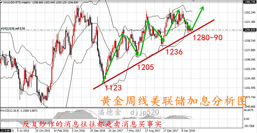 最近,由于长时间被各个同行在群里刷广告弄的吐血,周末,去理发,刚进店一个小姑娘带着上二楼找总监来剪发,问我:潘总,你想剪个什么发型?我顺口一句:不做头寸……不好意思,是寸头! 美联储年内的第二次加息即将来临,6月14(本周四凌晨2点),被大家炒作和期待的关键时刻终于到来了。黄金走了5个月的日线高位区间整理,而最近2个周更是窄幅小区间整理,能否借助本次事件引发大的突破,也是市场非常关注的。 1.近两周的黄金走势幅度小,来回的区间反复整理,上上周高点1307,低点1289,非农周消息集中但是全周波幅18美金。而上周高点1303,低点1290,全周波幅10美金,日线三根十字星,两根纺锤小阳线。 周