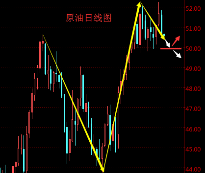 行情回顾 隔日油价亚欧盘油价震荡承压下挫,虽稍有反弹,但是始终突破不了上方阻力压制,以及伊拉克强硬表态不会限制产量昨日油价承压,导致投资者多头获利了解等,油价大幅下挫,刷新新低于49.62,而后油价快速反弹至50.49收盘,日K线收取长下影阴线。目前有关冻产消息频出,但是油价始终走不出一个区域整理,那么明天API
