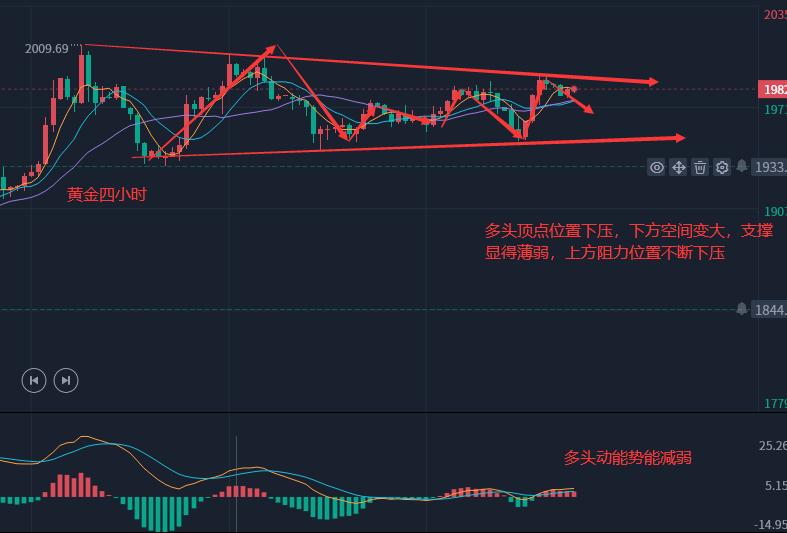 白天今金价短线下调之后进入了一个多空调整阶段,多空利润都很小,根据黄金四小时图来看,金价进入短期修正阶段,日内主要是消化昨日金价上涨带来的上涨势能不组的问题,晚间时段,金价将会迎来新的转机,当前黄金在四小时上表现,整体是一个偏向空头的,K线上的MA5日均线已经出现空头讯号,下方支撑明显不足,下方整体关注1950一线支撑位置,后续消息冲击的余温过去,我们还是的以高位看空为主的,多头反扑几率并不大,切记不要去高位追多,就算错过也不要去风险投资,稳健收利才是最好的选择,当前明显是上方承压,多头试探显得乏力,当前K线上显示出空头讯息,那么我们更应该去顺势而为 金价在小时小时线上虽然有多头趋势