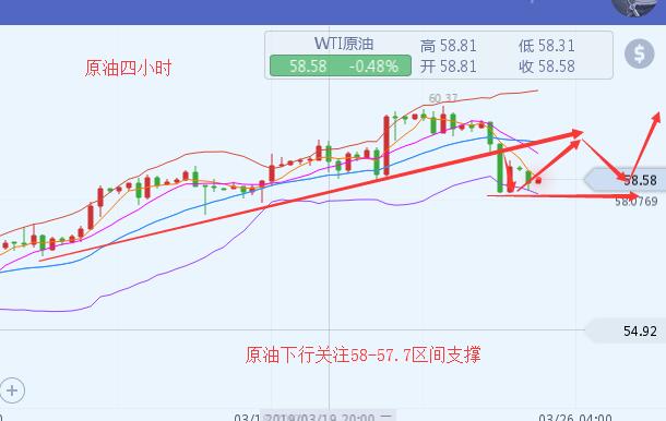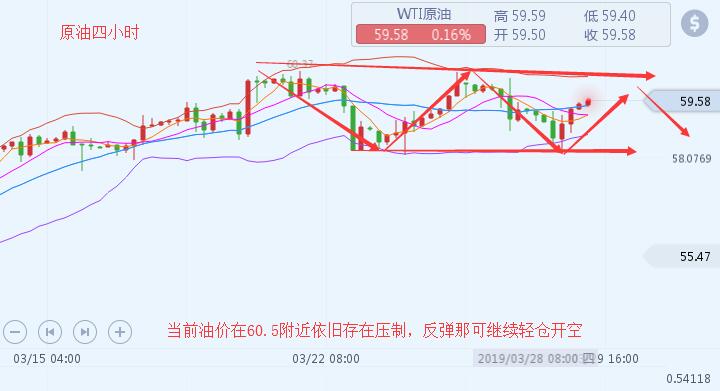 沐舒阳:3.27油价短线陷入震荡原油EIA如何布局稳健盈利 凌晨时分,原油API数据公布,短线上油价小幅受挫下滑至59.7,日内整体行情全部偏全程偏向震荡,一直在60美元附近来回震荡,多空陷入焦灼状态。由于早间API数据利空,晚间本人较为看好油价会在60.4美元承压下行,如果EIA数据能够利空的话,后市油价有可能会再度回到58美元一线。在整体操作上,本人建议以做空为主, 原油,当前原油上行受阻,短线上上升动能匮乏,日线上承压于60.4美元一线,而且当前下方强势支撑延伸到了57.7一线,日线上看来日内空头回踩还是小幅占据优势,上方如果不能有效的突破,后市油价将会强势回落到58美元一线,日线上方
